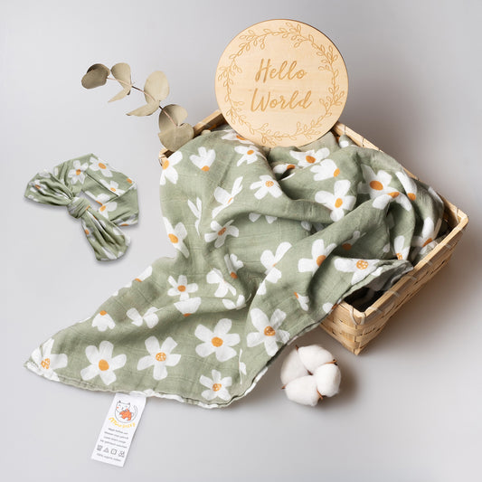 Organic Muslin Swaddle Set with Matching Bow, Daisy