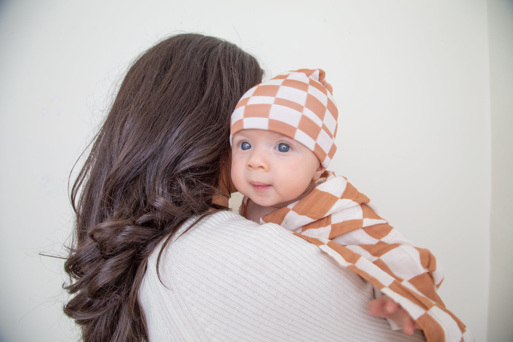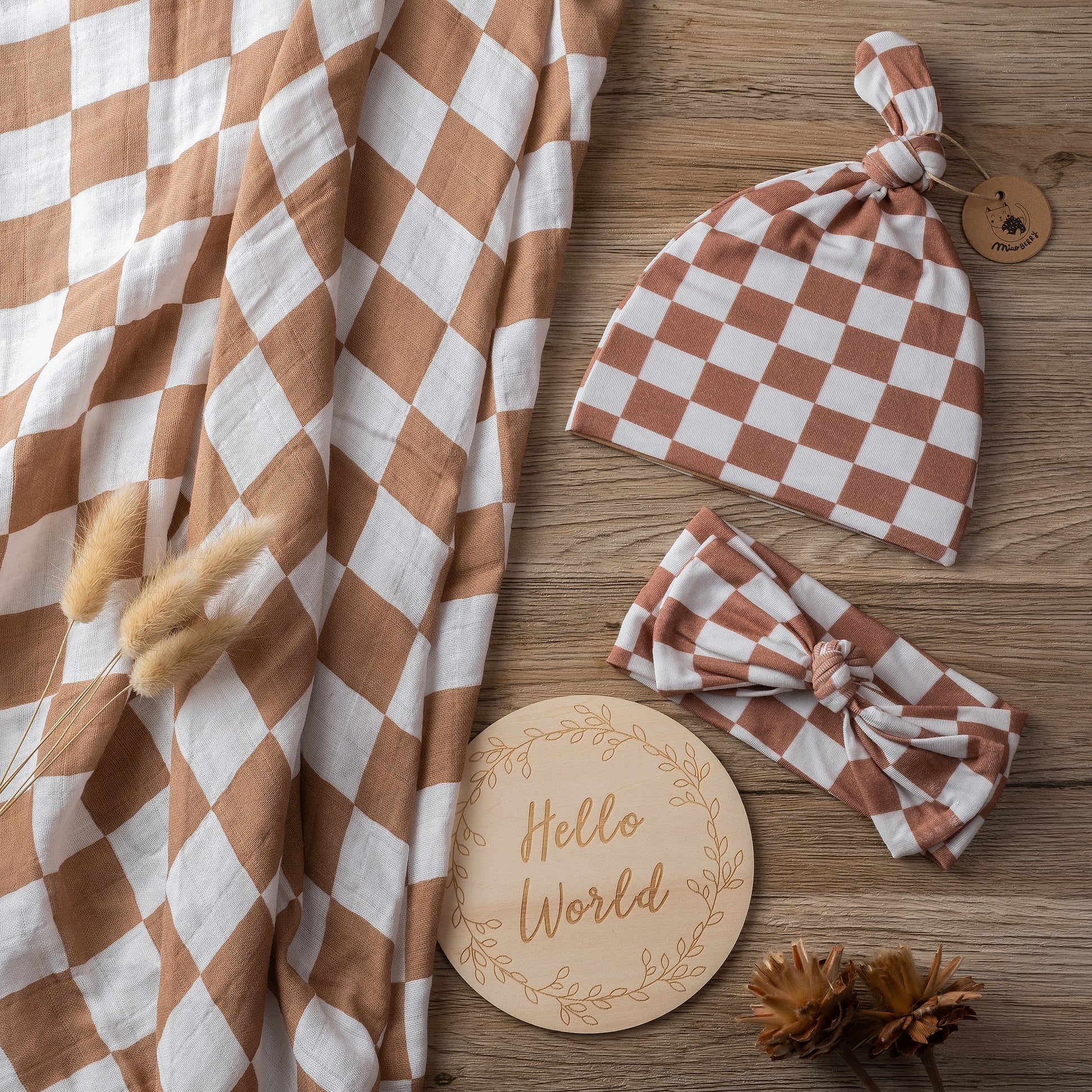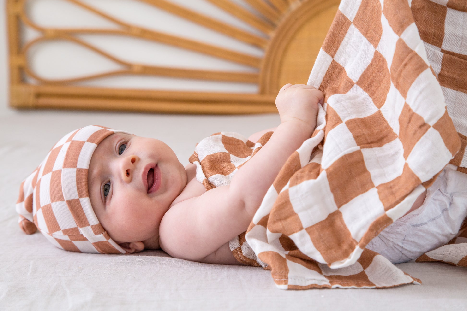 Organic Muslin Swaddle Set with Matching Beanie and Bow, Checkered Latte